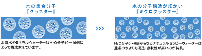 水の集合分子の事。このクラスターが小さいほど身体への吸収が早く、効率が良いとされている。ナチュラルセラピーウォーターのクラスターは特に細かい事からミクロクラスターと呼ばれています。